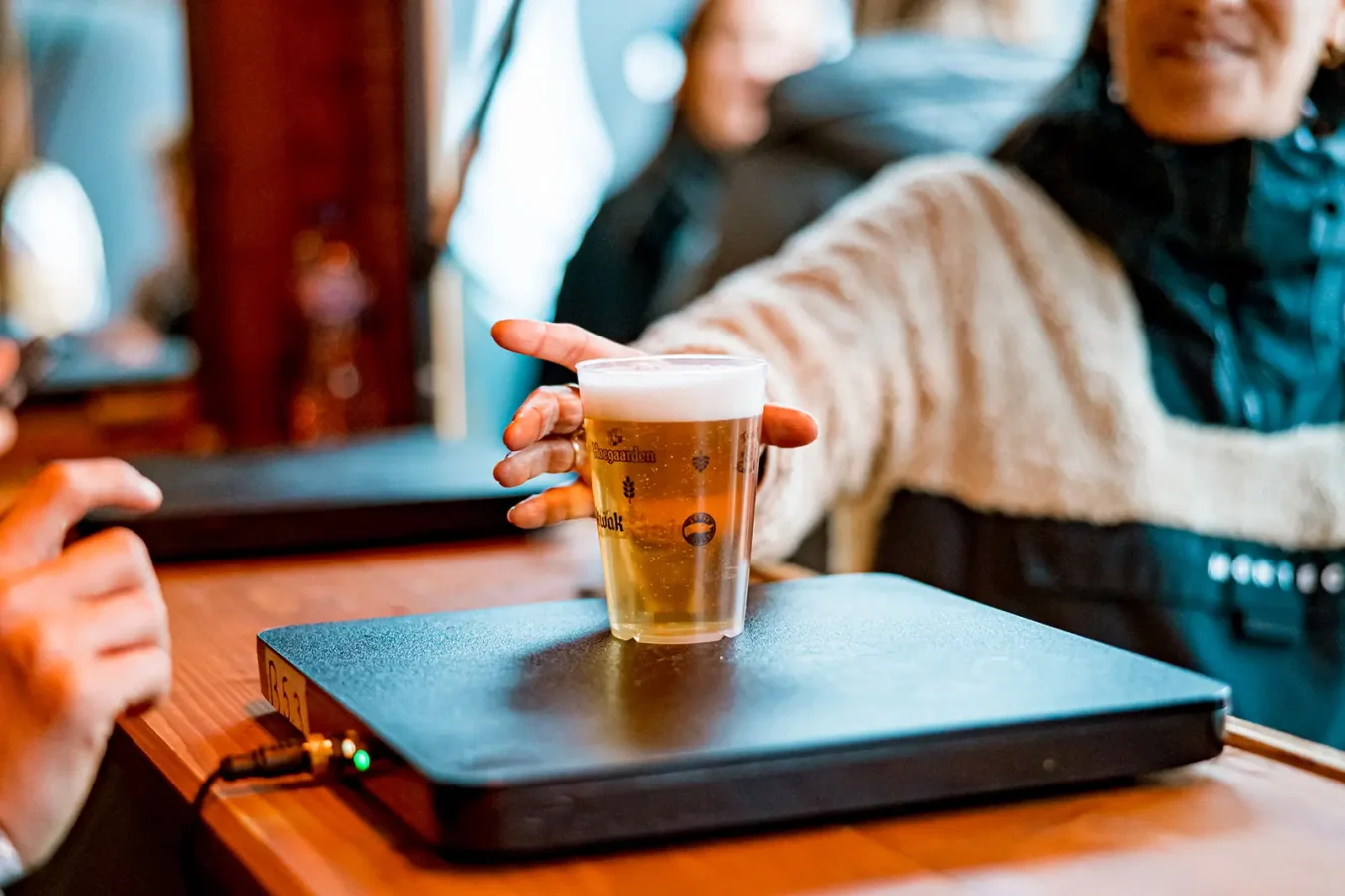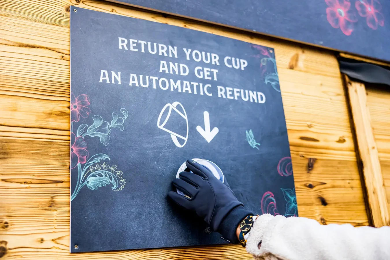 Elke beker bevat een unieke RFID-tag die tijdens de bestelling gelinkt wordt aan het betaalmiddel van de bezoeker. Bij teruggave worden de bekers automatisch gescand — zelfs in bulk — en wordt de waarborg onmiddellijk teruggestort, zonder wachttijden of manuele handelingen.